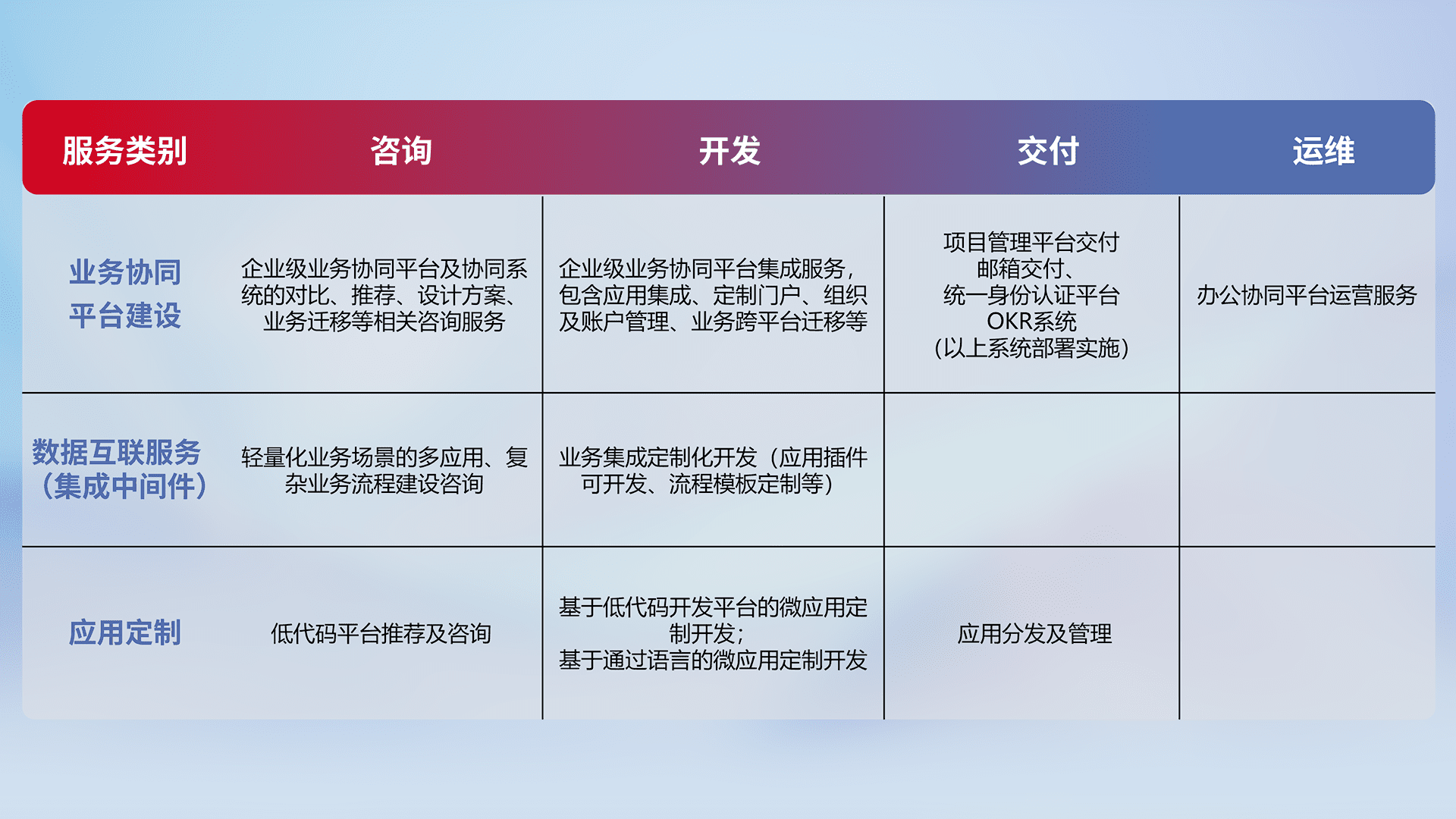 针对钉钉、、、企微、、IDaas等平台级产品提供产品的规划、、、方案、、交付、、、定制化开发等服务,,,,实现如统一协同办公、、、智能客户服务、、、混合会议管理、、、智能数据查询、、、、等业务场景,,,,实现数字化转型。。
